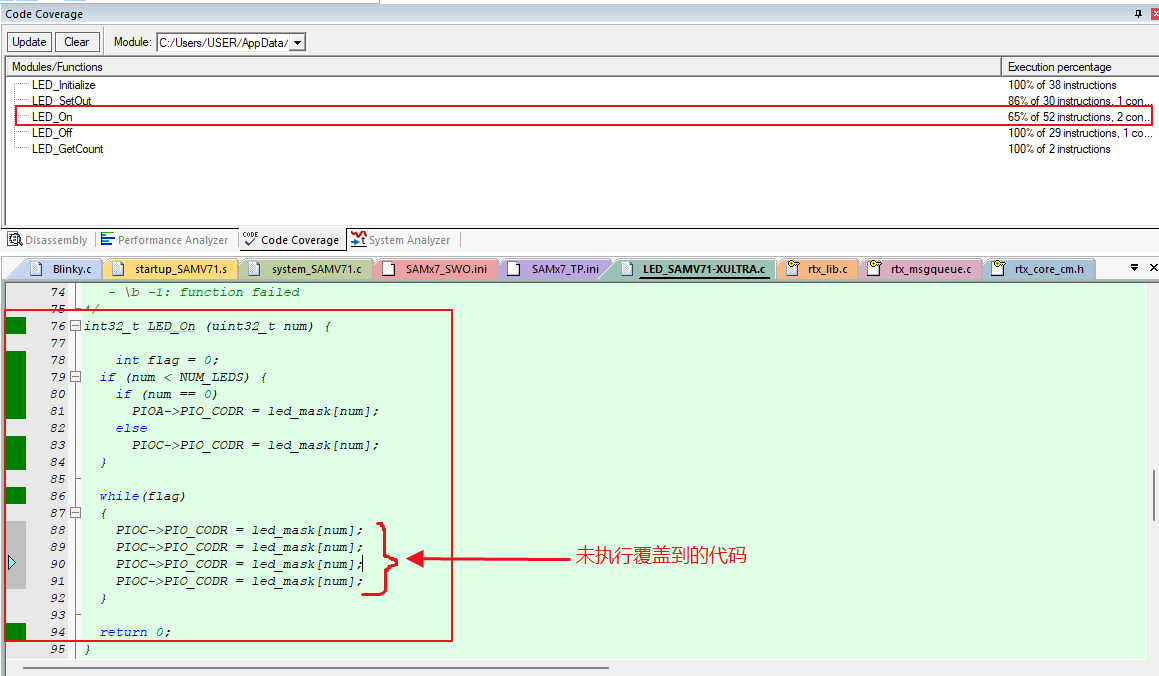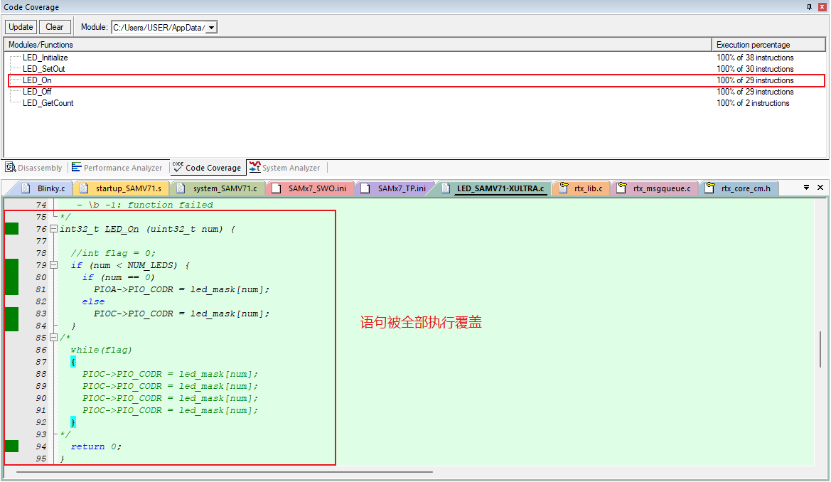 1)、图4-1是对于LED_On函数的代码覆盖率检测。从图中可以看到对应函数的代码覆盖率是100%的。