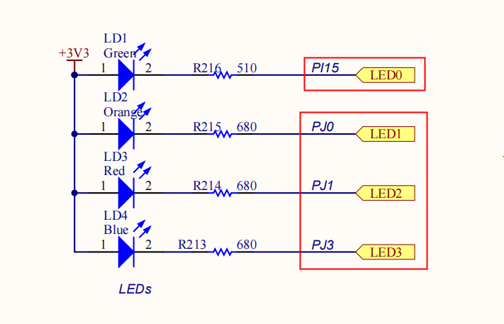 1. STM32F769开发板上LED灯的原理图如图3-1所示: