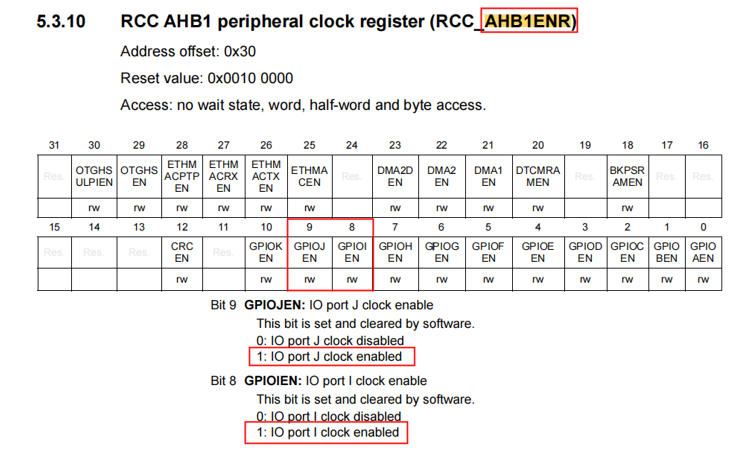 3. 使能GPIOI与GPIOJ的时钟:“__setbit(RCC->AHB1ENR, 8); __setbit(RCC->AHB1ENR, 9);”这样设置的依据如图3-2所示: