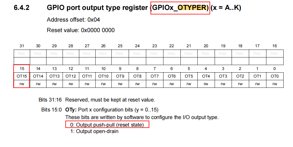 5. 配置GPIOI_15引脚的输出类型为Push-Pull:“__clearbit(GPIOI->OTYPER, 15);”设置的依据如图3-4所示: