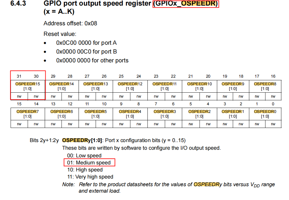 6. 配置GPIOI_15引脚的速度为中速:“__setbit(GPIOI->OSPEEDR, 30);__clearbit(GPIOI->OSPEEDR, 31);”,设置的依据如图3-5所示: