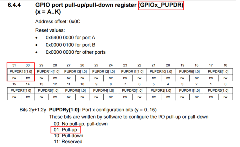 ● 配置GPIO引脚的上拉/下拉电阻:为了避免引脚在未连接时浮空,可以配置内部的上拉或下拉电阻。这个配置通过GPIOx_PUPDR寄存器来实现。