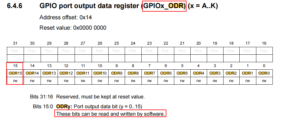 4. 配置GPIOI_15引脚的模式为输出模式:“__setbit(GPIOI->MODER, 30);__clearbit(GPIOI->MODER, 31);”,设置的依据如图3-3所示: