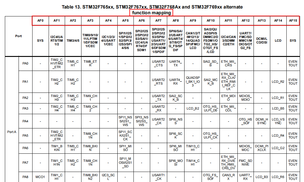 (1)、先查看复用功能寄存器的功能Map表,找到需设置的引脚数,确认复用功能,如图5-1所示: