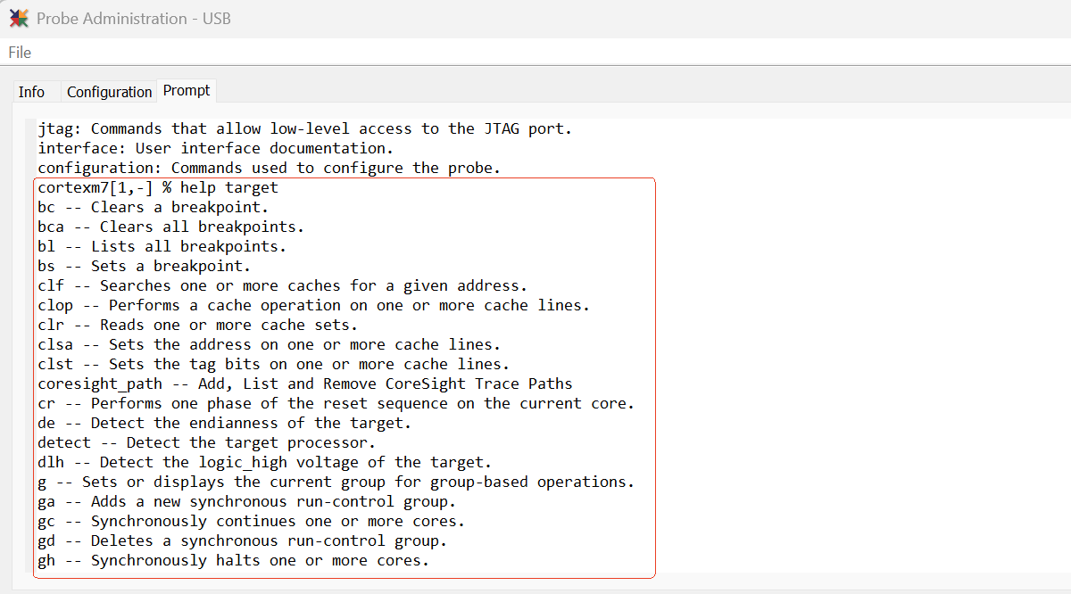 在Greenhills的MULTI的Probe管理器界面通过“Help”了解各类型指令。