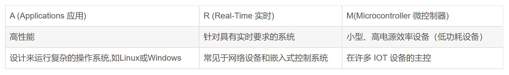 下面表格介绍了 ARM 的 A 、R和 M 三个架构的特点: