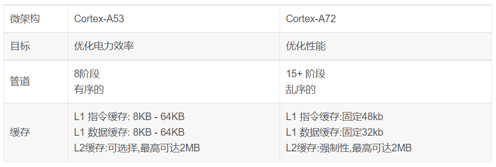 例如,Cortex-A53和Cortex-A72都是Armv8-A架构的实现。这意味着它们具有相同的架构,但它们具有不同的微架构。如下图和表所示: