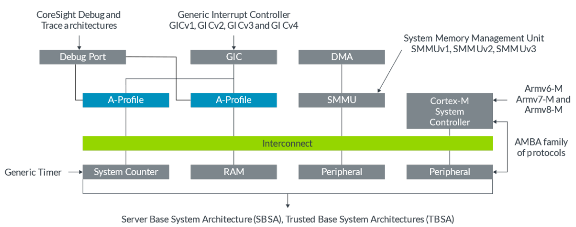ARM架构是最有名的ARM规范,但它并不是只有这些。ARM对于构成现代系统芯片的许多部件都有类似的规范。