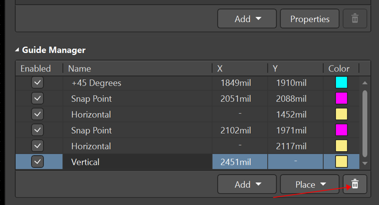 放置完需要的参考点和参考线之后,在PCB属性面板的Guide Manager中可以看到参考点和参考线的坐标和颜色,在这里可以对它们进行修改。也可以通过Guide Manager的“Add”和“Place”来进行添加和放置。