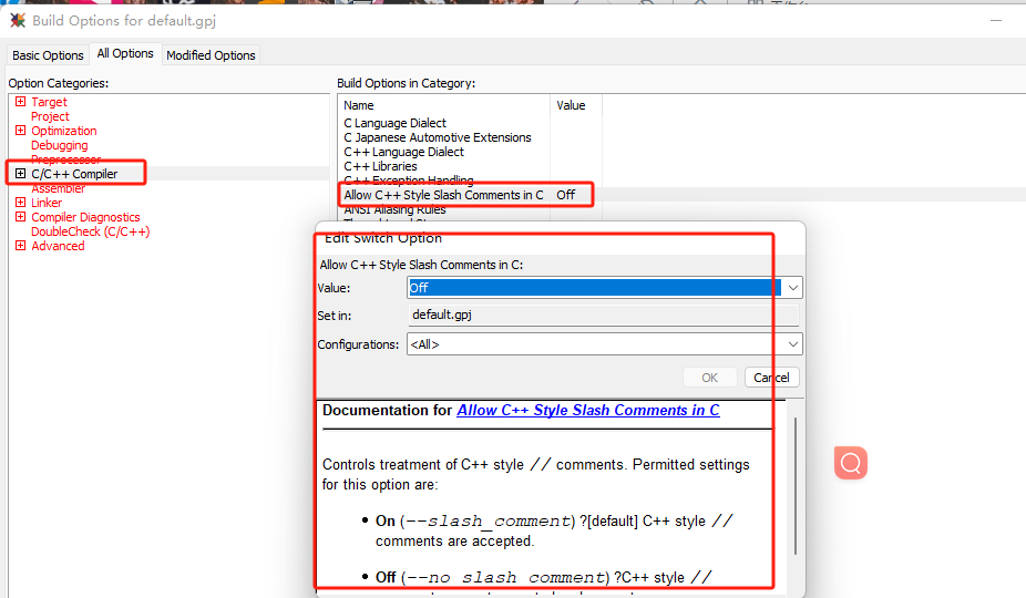 2)第二种情况是由于GHS的配置导致的。在build options中有C/C++ Compiler->Allow C++ Style Slash Comments in C的一个配置选项。这个配置选项就是对于C++的注释风格是否兼容进行配置。(如图4-2)