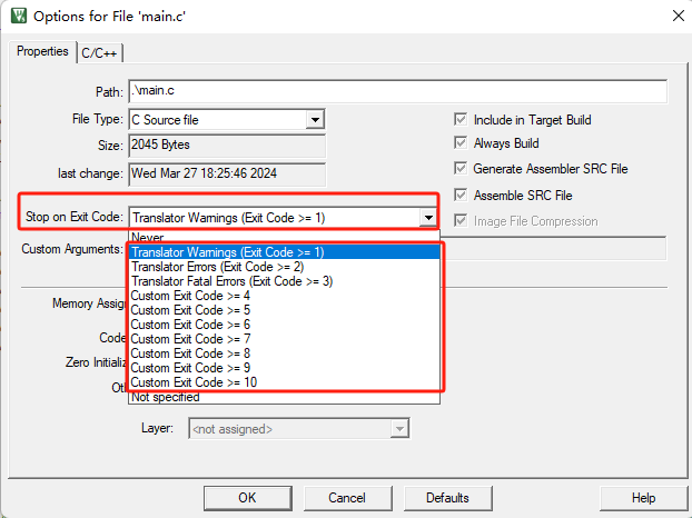 3)、在MDK中可以通过在对于单文件的配置中去设置退出条件。在Option窗口中,在Properties中的Stop on Exit Code中就可以设置退出代码(如图4-3)。