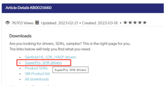 2、解决方法就是在加密狗的驱动官网下载 在网页上找到 Drivers and_Downloads-> SuperPro, SHK drivers (如图4-2-1和图4-2-2),然后下载Sentinel Protection Installer Version 7.5.0 (Installer Only)这个版本的驱动程序进行安装。