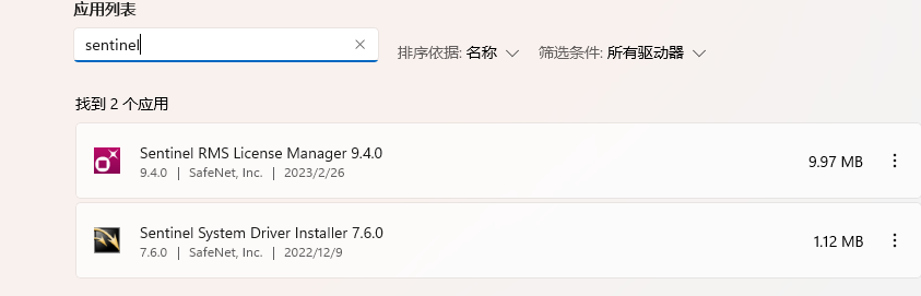 3、安装前需要先卸载之前安装过的驱动程序。可以在电脑的应用列表中搜索sentinel,找到驱动程序进行卸载。(如图4-3)